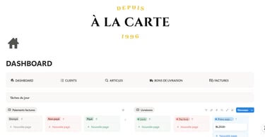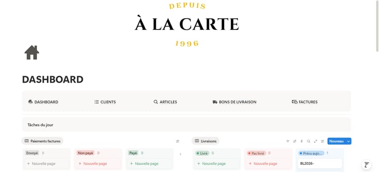 Nous avons mis en place un logiciel sur mesure pour la société À La Carte pour leur permettre de pouvoir gérer leurs journées simplement, avec les tâches en cours, les livraisons prévu, les créations de bons de livraisons, de facture ainsi que de pouvoir gérer leurs stocks.